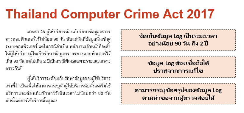 ตามพรบ. คอมพิวเตอร์ฉบับปีพ.ศ. 2560 บริษัทใดก็ตามที่ ให้บริการอินเตอร์เน็ต แก่ผู้ใช้งาน ไม่ว่าจะเป็น พนักงานหรือลูกค้าก็ตาม จะต้องเก็บ Log ไว้ให้ตรวจสอบอยู่เสมอ โดยจะต้องจัดเก็บเป็นเวลาอย่างต่ำสุด 90 วันและหากเจ้าหน้าที่ต้องการให้จัดเก็บเป็นกรณีพิเศษ บริษัทจะต้องจัดเก็บ Log นั้นๆ ไว้เป็นเวลาอย่างต่ำถึง 2 ปี นอกจากนั้นแล้วข้อมูล Log จะต้องน่าเชื่อถือ ปราศจากการแก้ไข และบริษัทต้องสามารถให้รายงานข้อสรุปตามคำขอจากผู้ตรวจสอบได้ ซึ่งจะต้องทำเป็นรายงานสรุปให้อ่านได้ง่ายไม่ใช่แค่ส่งไฟล์ Raw Log ให้แก่ผู้ตรวจสอบ